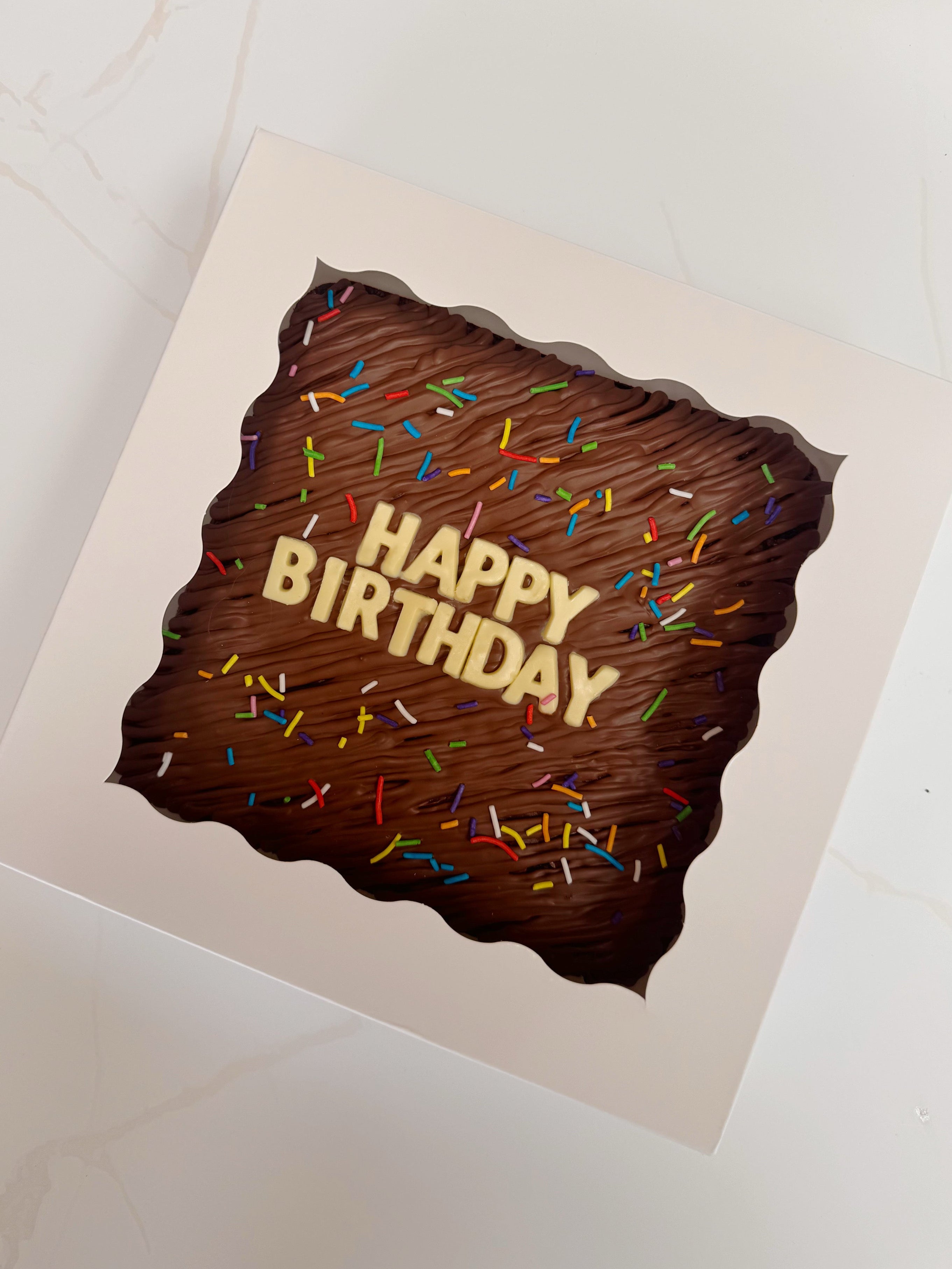 Create a custom brownie slab with your own message, made fresh to order. Perfect for birthdays, celebrations, or just because.